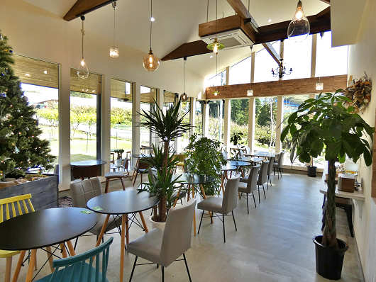 そして奥へ進むとテーブル席がありました。ここは三方を大きなガラス窓に囲まれてとても明るくて、照明は必要ないって感じでした。
