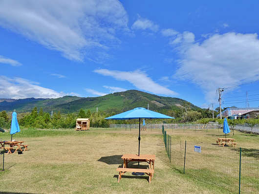 テラス席の前にはとても広い芝生広場になっていて、テーブルや小さな小屋のような建物などもありました。右のほうにはフェンスで囲われた一角もあって、ドッグランのようになっていてワンちゃんを遊ばせることもできるようでしたが、店員さんのよるとこの広場はワンコ専用って訳じゃなくて自由に寛げるスペースだそうです。
