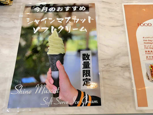 今回も私はランチでお腹がいっぱいになって、これ以上はあまり入りそうになかったので、数量限定であっさり系のシャインマスカットソフトクリームのカップ入りを注文しました。
