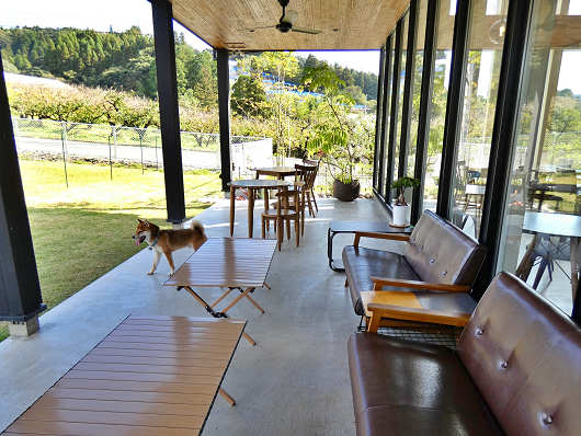大きなガラス窓の外には広々としたテラス席もありました。そして画像には一匹のワンちゃんが写っていますが・・・