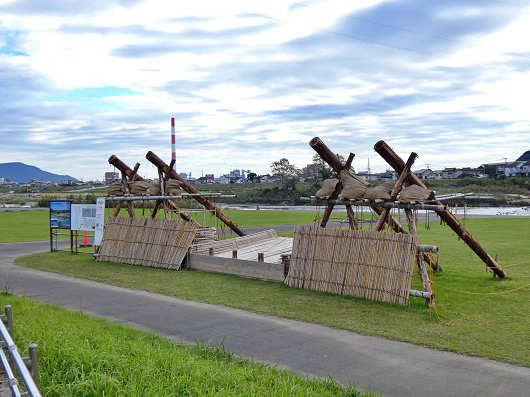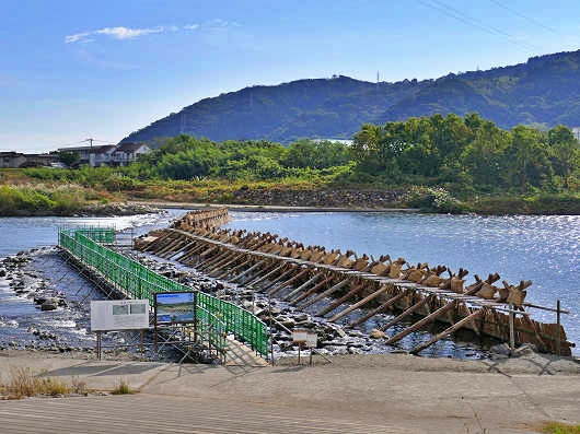 この日ランチをいただくカフェはこのすぐ近くにあって、この時はカフェのオープンまでまだ時間がたっぷりあったので、河川敷に設置されている実物大の鮎やなの模型も見に行ってみました。
