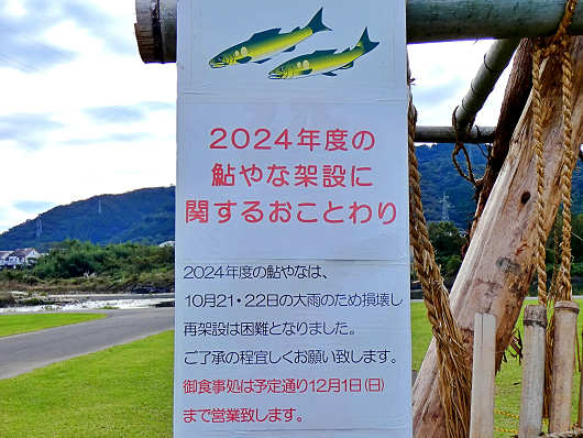説明板の横にはこの様な看板があって、今年の鮎やなは10月21,22日の大雨で損壊して再架設を断念したんですね。