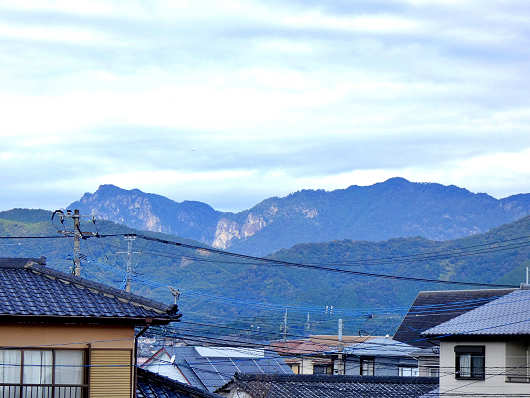 鮎やなの見物は残念な結果でしたが、大瀬川の河川敷から山のほうを眺めるとはこの様な景色が見えます。この山は行縢山(むかばきやま)といって奇岩絶壁がそそり立つ険しい山で、一度は登ってみたい山なんですが、この歳になるともう険しい登山は体力的に無理でしょうね?