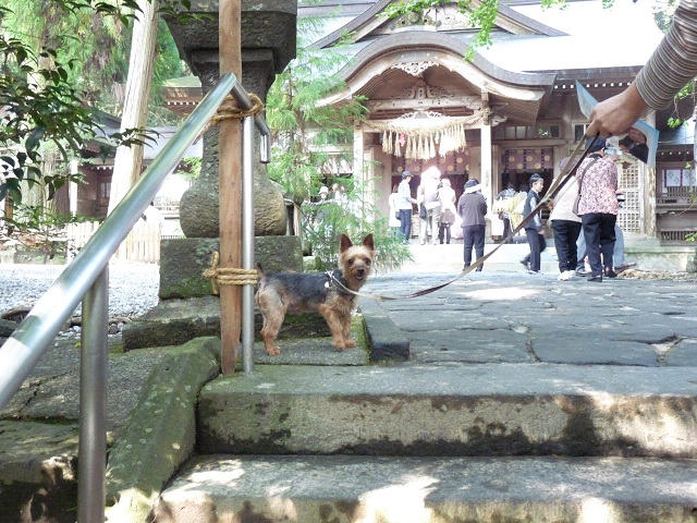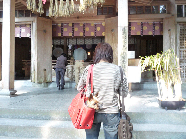 りゅう君はママと一緒にお参りしています、でもりゅう君、神様にお尻を向けるなんて失礼だよ。