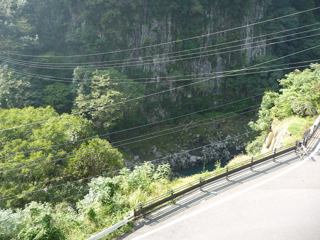 しばらく急な下り坂を降りていくと、渓谷が見えてきました、でもいくら歩いても高千穂峡に到着しないよ、道路が狭くて歩道が無いから車は怖いし、もう20分くらいは歩いたかな?