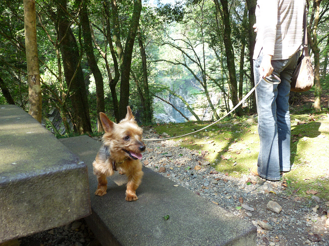 向こうに見えてる滝が真名井の滝だよ、ここへ来る時に見た玉垂れの滝がおのころ池に溜まって、溢れた水がこの滝になって流れ落ちてるんだって、