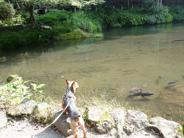 おっ、見慣れない魚が泳いでいるよ、りゅう君は興味深そうに池を覗き込んでいます、