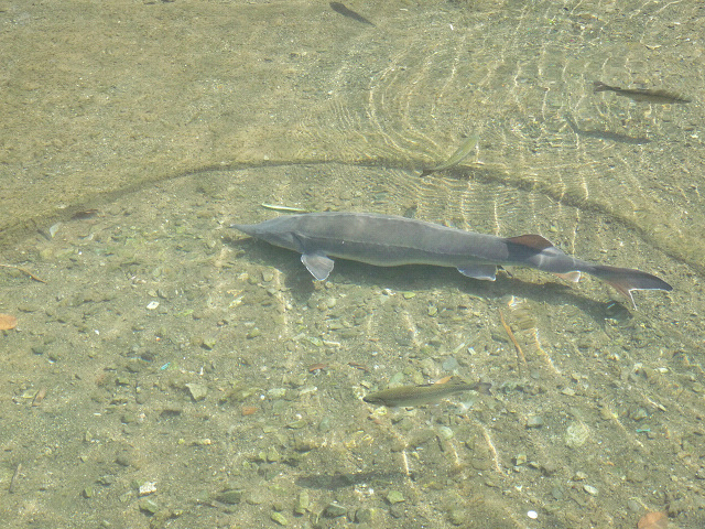 この魚はチョウザメだよ、この魚の卵からキャビアが取れるんだよね、でも何で高千穂峡にチョウザメなの?
