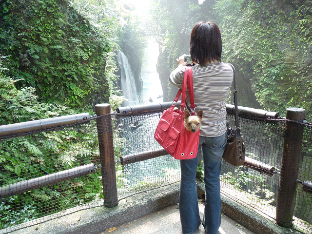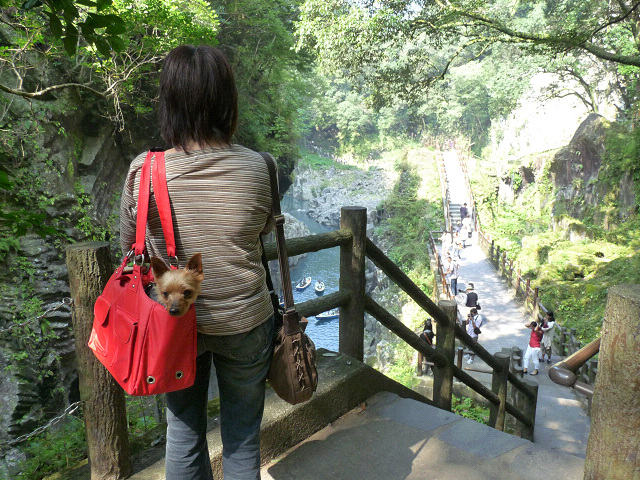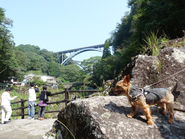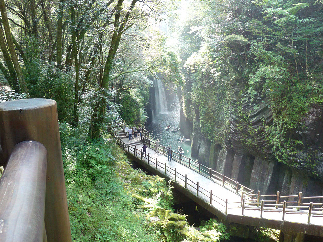 やっと高千穂峡が見えるところまで来ました、うしろに見える滝は玉垂れの滝だよ、