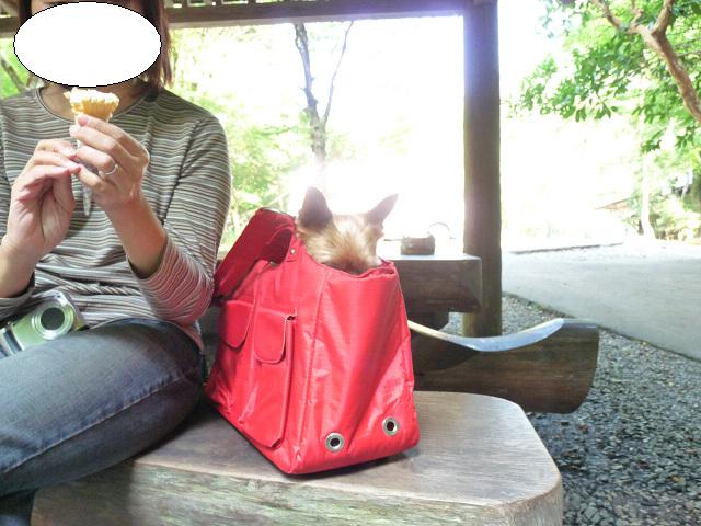 ママはおいしそうにソフトクリームを食べてるけど、りゅう君はソフトを貰えなかったのでスネてバッグの中に頭を突っ込んでいます。