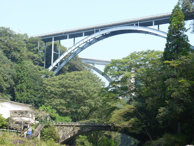 神橋のところまで来ました、新旧3つの橋が見事な組み合わせだよね、いちばん手前の古い橋が神橋、そのすぐ上にあるのが高千穂大橋、その奥の橋が神都高千穂大橋だよ、左下に見える建物は高千穂名物が味わえる郷土料理店のあららぎ乃茶屋だよ、パパはここでカッポ酒を飲みたかったなぁ、って言ってたよ。