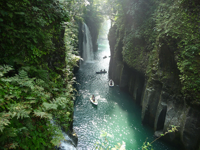 ここからの眺めは高千穂峡を代表する景色だよね、パンフレットなんかには下の道から撮影した写真がよく載ってるけど、ここはそれよりも1段高い展望台からの眺めだよ。