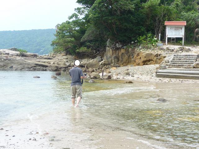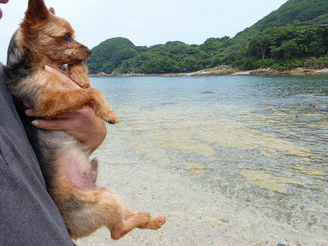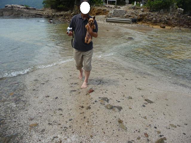 パパが海を渡り始めました、画像では見えないけど僕も抱っこされてるよ。