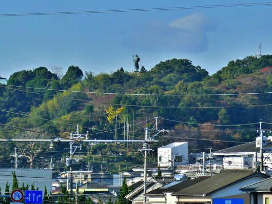 この日は延岡市内でお昼ご飯を食べる予定ですが「唄げんか焼」を買うために早くお家を出発したので、食事の予約時間まではまだ2時間近くあったので、東九州道には乘らずに国道10号を南下して延岡市街地へ入りました。市街地へ入ると山の上に建つ大きな銅像が見えてきたので、この銅像を目指して住宅街の狭い道を登って行きました。
