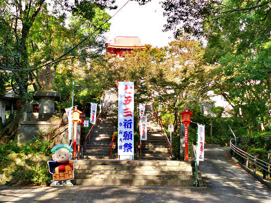 車同士がすれ違えないほどの狭い道を登って行くと、道路は行き止まりになって狭い駐車場へ出ましたが、その奥には神社の山門のようなものが見えました。そして山門へと続く石段の手前には「七五三祈願祭」と書かれた看板が立てられていました。