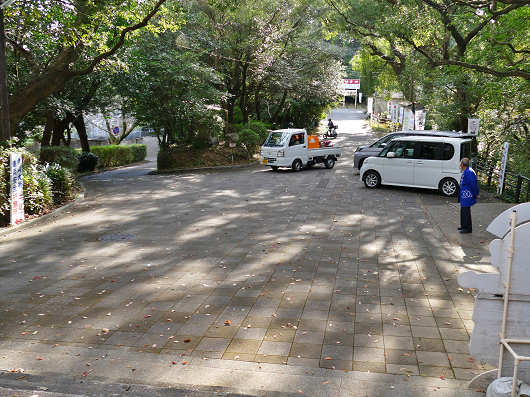 ここが行き止まりにある駐車場です。線引きされている区画は数台分のスペースしかありませんが、この日は七五三のお参りで多くの人が訪れるそうで、ここに車を停めたら迷惑になると思って帰ろうとしたら、管理のおじさんがこの時間帯ならまだ満車にならないから車を停めてもいいよと言ってくれました。宮崎県の人ってとても優しいですね。