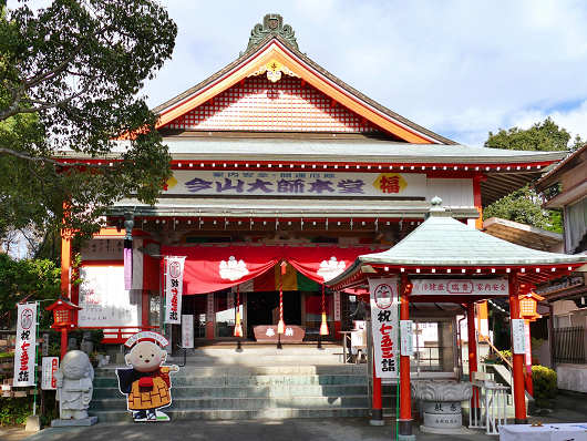 石段を登り切って山門を潜るとお社が見えてきます。この建物は「今山大師本堂」です。でもここからは山上に建つ弘法大師の像はまだ見えないんですよね。