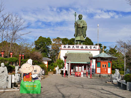 管理のおじさんに感謝しながら駐車場に車を停めたら、さっそく山上に見えていた大きな銅像を目指します。石段の登り口にはこの様な看板が立てられていて、ここには「今山大師」という寺院があって、日本一の大きさを誇る弘法大師の銅像があるようでした。