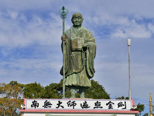 今山大師本堂の横からはさらに上へと石段が続いていたので、石段を登りきるとようやく弘法大師像が見えてきました。