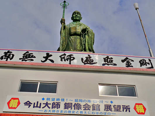 弘法大師像は建物の屋上に建てられていますが、建物には「今山大師 銅像会館 展望所」と看板が掲げられていたので、大師像の足元まで登ると延岡市内が一望できるようでした。でもこの時は時間が早かったので、屋上への階段には鍵が掛けられていて登ることができませんでした。