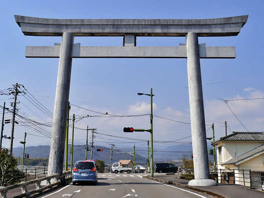 都農神社は国道10号沿いに表参道よりも大きな鳥居が建っていますが、ちょうど信号待ちで鳥居の下に停まっていた車と比べても、この鳥居がいかに大きいかよく分かりますよね。