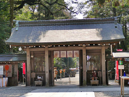 砂利の敷かれた厳かな雰囲気の参道を歩いて行くと、正面に大きな樹木に囲まれた山門が見えてきましたが・・・