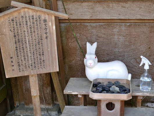 これは「撫でウサギ」です。このウサギを撫でると無病息災になるそうです。ウサギの前にはたくさんの神石が収められていますね。