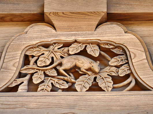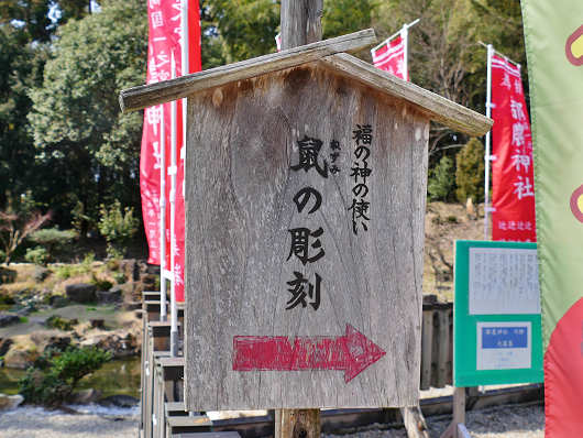 拝殿で参拝を済ませて横を見たら、福の神の使い「鼠の彫刻」と書かれた木札が立てられていたので、矢印に従って本殿の方へと向かいました。