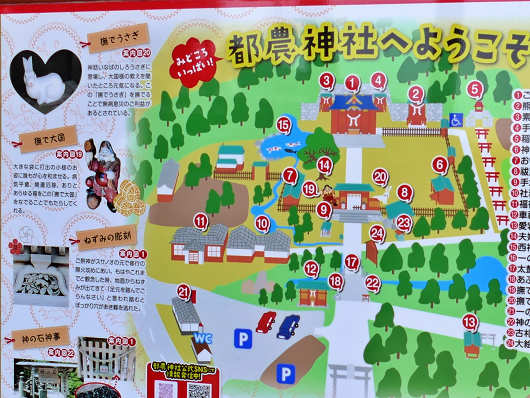 拝殿へ向かって参道を歩いていると、都農神社の案内図がありました。これには ゛都農神社はみどころいっぱい ゛と書かれていたので、今回はこの案内図に書かれている見所へ行ってみました。