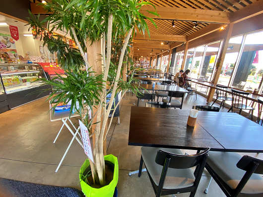 駐車場に車を停めたらさっそく館内へと入りました。館内へ入ってすぐのところには、お弁当やピザなどのテイクアウトコーナーがあって、その前には国道に向かって大きなガラス窓のある明るいフードコートがありました。ここが看板に書かれていた「ゴボチ テラス」なんでしょうか?