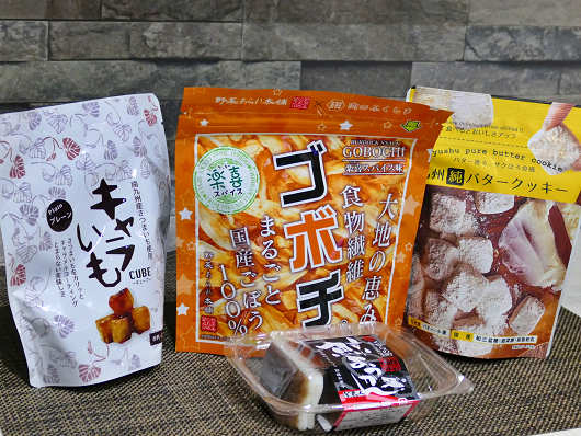 画像はママンマルシェで買って帰ったものです。左からさつまいもをダイス状に小さくカットしてキャラメルをコーティングした宮崎県のお菓子「キャラいも」です。そしてその横は楽喜(ラッキー)スパイス味のゴボチ、そしてお菓子の昭栄堂(都城市)の九州純バタークッキーです。手前には道の駅 高岡ビタミン館で買った「鯨ようかん」も写っていますが、これはもう紹介したので省略しますね(笑)