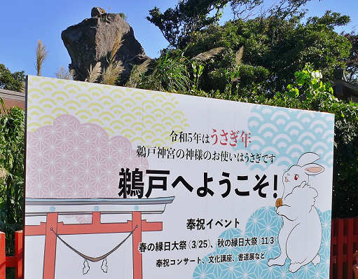二ノ鳥居を潜ったすぐ先には ゛令和5年はうさぎ年 ゛と書かれた大きな看板がありました。うさぎは鵜戸神宮にとっては特別な存在の動物なので、詳しいことはもう少し後で説明しますね。この看板の後ろには大きな岩も見えていますが、この岩は本殿を守護するように立っていることから「神犬石(いぬいし)」と呼ばれているそうです。