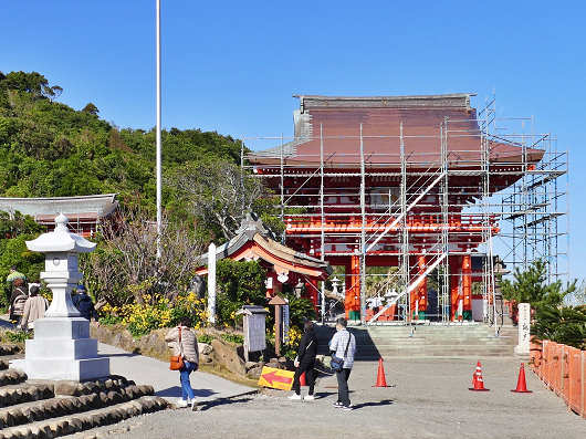 神門の次に見えてきたのは楼門ですが、ここは工事中で楼門全体に足場が組まれていて、通行止めになっていたので左の道へと迂回しました。