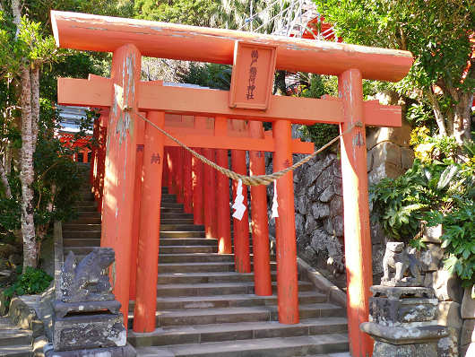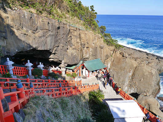 さらに参道を進んで行くと参道は大岩に突き当たり、最後は急な下り坂の石段が海に向かって伸びていました。鵜戸神宮の本殿は石段を降った左側の岩窟の中に鎮座しています。