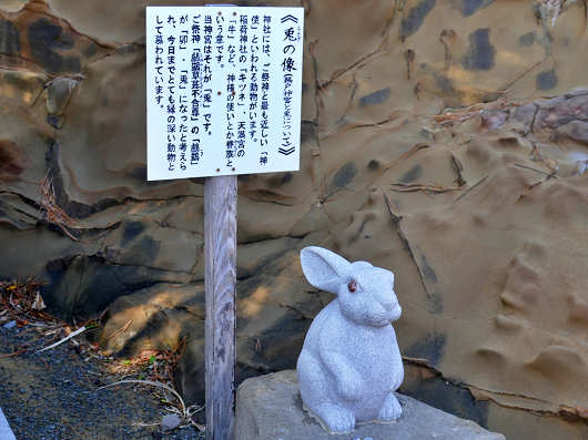 工事中の楼門を迂回したら、再び海沿いにある参道へ戻って本殿を目指しますが、参道沿いには可愛らしいウサギの像がたくさん並んでいて、最初に見えたウサギの像の後ろには説明板も立てられていました。