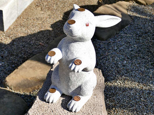 たくさん並んだウサギの像の中には両手、両足、顔にまでたくさんのお賽銭?を貰った幸せなウサギもいました(笑)