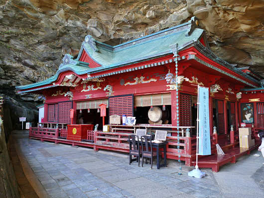 急勾配の石段を降ったら、まずは岩窟内に入って鵜戸神宮の本殿へ参拝しました。普通の神社は拝殿の奥に本殿があって、お参りは拝殿に向かって行いますが、鵜戸神宮は本殿、幣殿、拝殿が一体となった権現造といわれる構造なので、直接本殿に向かってお参りをするようです。