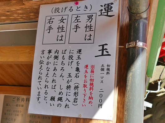 本殿への参拝を済ませたら運玉投げです。運玉はマスの中に5個入っているので、横の箱に200円を入れて運玉を取り出します。