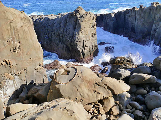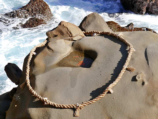 そして岩窟を出た眼下の岩場にある、豊玉姫が乗って来た亀が岩になったと言われる「亀石」の背中の窪みに向かって運玉を投げ入れます。男性は左手で、女性は右手で投げ入れるのが作法ですが、左利きの私は毎回どちらの手で投げ入れたらいいんだろうか?と迷うんですよね(笑)
