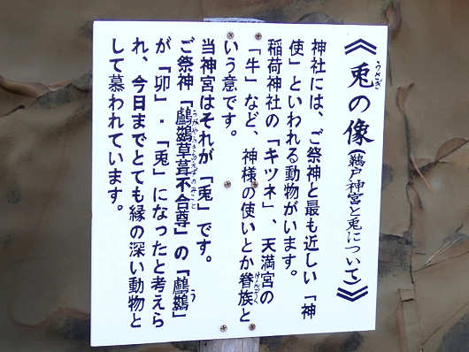これがその説明板のアップです。これを読むと鵜戸神宮ではウサギが神様の使いだそうです。来年は卯年なので鵜戸神宮にとっては特別な年なのかもしれませんね。でも兎や牛は干支にもなっていますが、キツネは干支になっていないので、稲荷神社はちょっとかわいそうですね(笑)