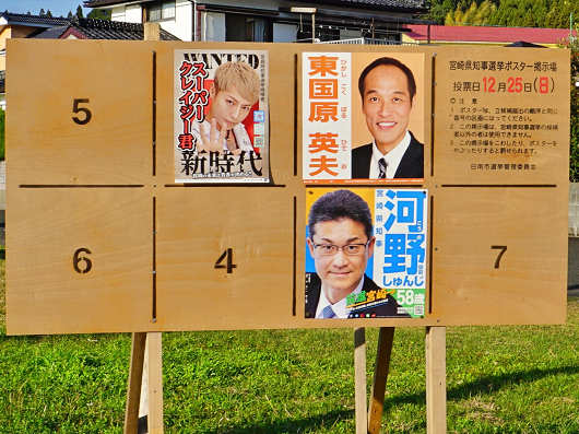 参拝、運玉投げを済ませて鵜戸神宮を出発して国道220号へ出ると、宮崎県知事選の選挙ポスターが道路沿いに掲示されていました。投票日は明日(12/25)で、現職知事と東国原さんの事実上の一騎打ちといわれていますが、果たして誰が次の宮崎県知事になるんでしょうね?