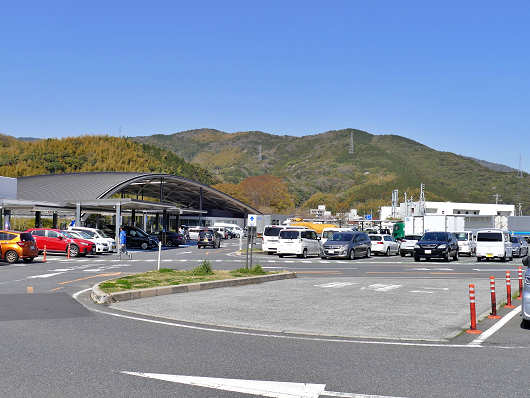 国道2号から道の駅に入ると駐車場はとても広くて、特に大型トラックの駐車スペースが広くて、一瞬高速のSAに入ったような感覚になりました。ちなみに駐車場には普通車125台、大型車43台も停められるそうです。りゅう君と車中泊をした佐波川SA上りが普通車79台、大型車49台なので大型車で比べるとほほ同じような広さですが、普通車の駐車スペースはこちらの方がかなり広いですね。