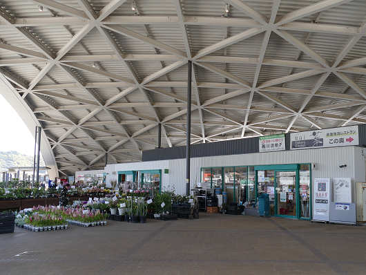 この建物が農産物や生花、お土産品などを売っている物販施設です。店頭にはたくさんの生花などが並べられていましたが、大きな屋根の下が広いスペースになっていたので、イベントなどの時には雨に濡れなくていいですね。