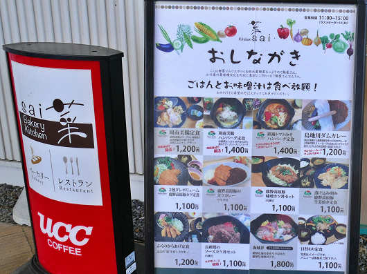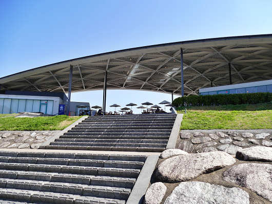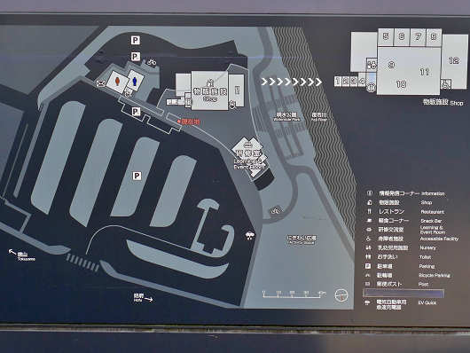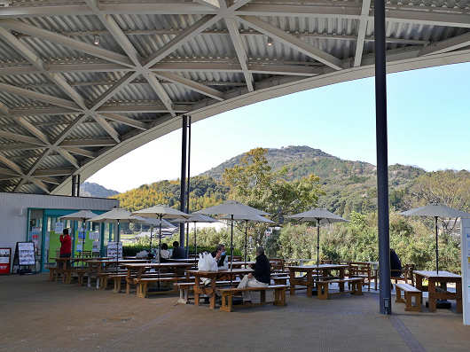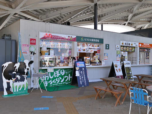 こちらは休憩スペースを兼ねたイートインコーナーで、その左にはレストランがあって、右側には研修交流施設がありますが、全て大きな屋根の下にありました。各テーブルには備え付けのパラソルもありましたが、ここは屋根の下なので必要ないような気もするんですが・・・(笑)