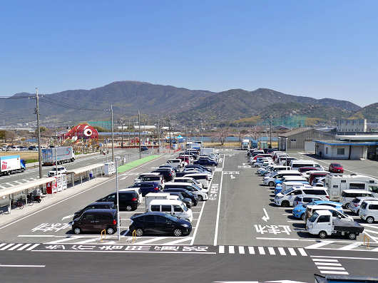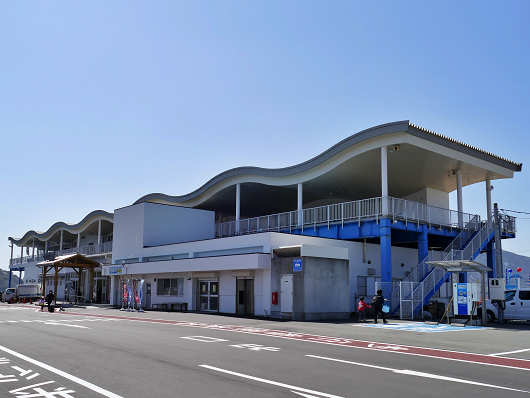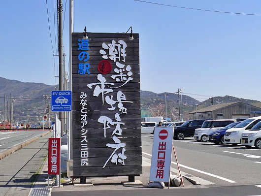 しばらくすると道路は三田尻港のある海へ突き当たって「道の駅 潮彩市場 防府」の看板が見えてきました。看板には「みなとオアシス 三田尻」とも書かれていました。みなとオアシスは国交省によって登録された港に関する交流施設などのことで、全国には100か所以上もあるそうです。