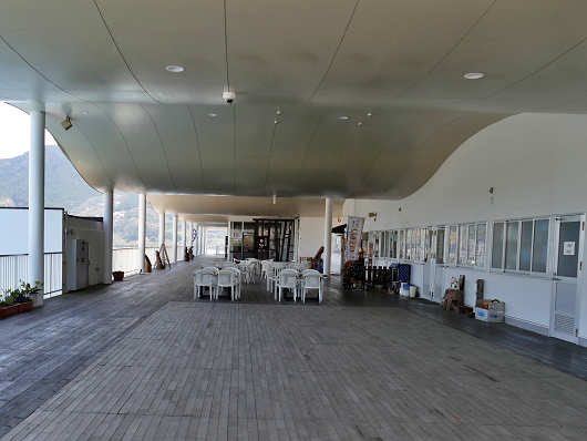 さっそく2階へ上がってみましたが、展望デッキはとても広くて、その上には外からも見えていた波打った屋根がありました。そしてイス、テーブルなども置かれていましたが・・・