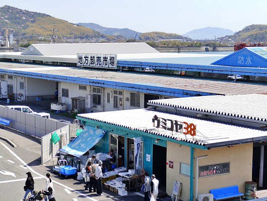 駐車場と港の間には「地方卸売市場」と「ウミコヤ 38」と看板が掲げられた牡蠣焼き、海鮮料理の提供や鮮魚の販売などを行うお店があって、多くの人で賑わっていました。規模は全く違いますが、ここは下関市の唐戸市場(カモンワーフ)を小さしたような感じのところでした。
