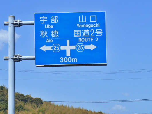 国道2号をしばらく進むとこの様な標識が見えてきました。これから向かうのは「道の駅 あいお」ですが、標識には「秋穂」と書かれていて「Aio」とローマ字でふり仮名が付いていました。ここも事前に調べてなかったところですが、「秋穂」を「あいお」とは読めませんよね。
