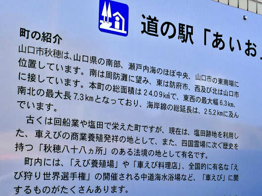 ここには秋穂町の紹介が書かれたパネルもありました。これによるとここは「車えびの商業養殖発祥の地」のようでしたが、道の駅の周辺には田んぼが広がっているだけで海も見えず、どこで車えびの養殖をしているんだろう?って感じでした。