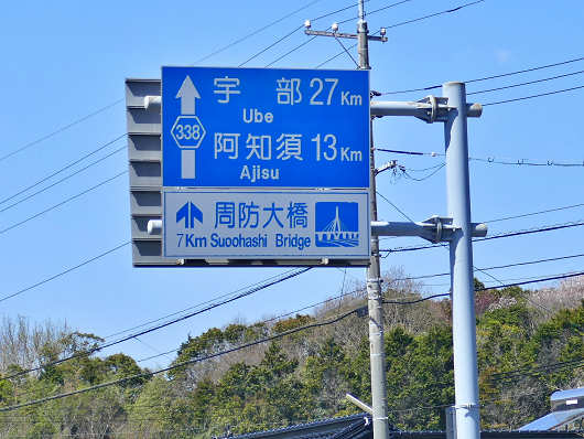 県道338号を走っていると道路上にはいくつもの標識が見えてきますが、どの標識にもこの様に「周防(すおう)大橋」と書かれていました。初めて聞く名前の橋ですが、この辺りでは有名な橋なんでしょうね?